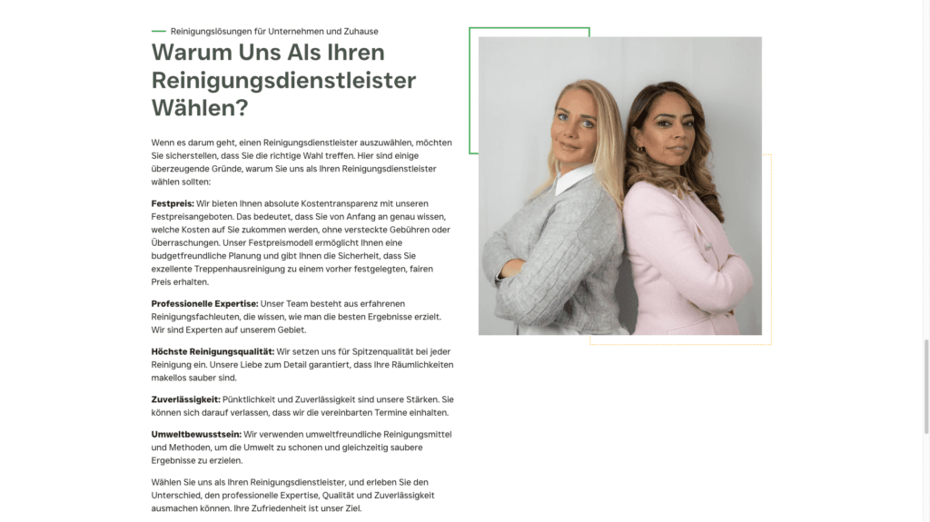 - Umfassende Informationen: Detaillierte Beschreibungen der Reinigungsdienste und nachhaltigen Praktiken.