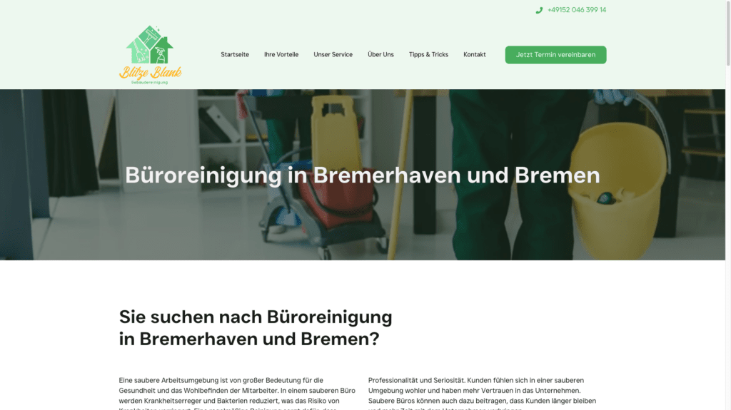 Blitzeblank BHV ist ein Reinigungsunternehmen, das sich auf professionelle Reinigungsdienste spezialisiert hat. Das Unternehmen legt großen Wert auf Sauberkeit und Nachhaltigkeit, was sich auch in ihrem Online-Auftritt widerspiegeln sollte.