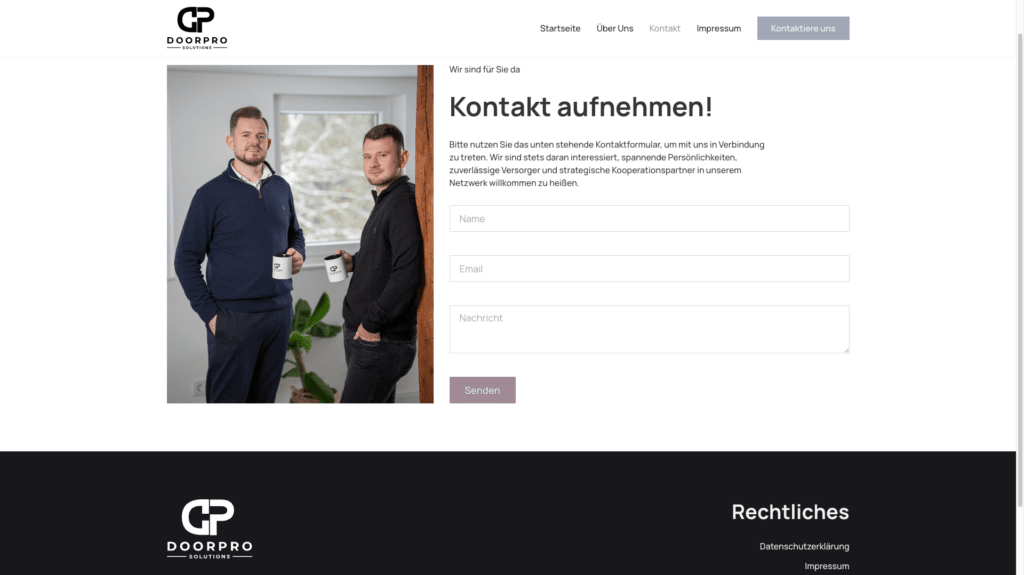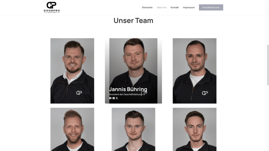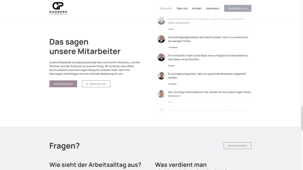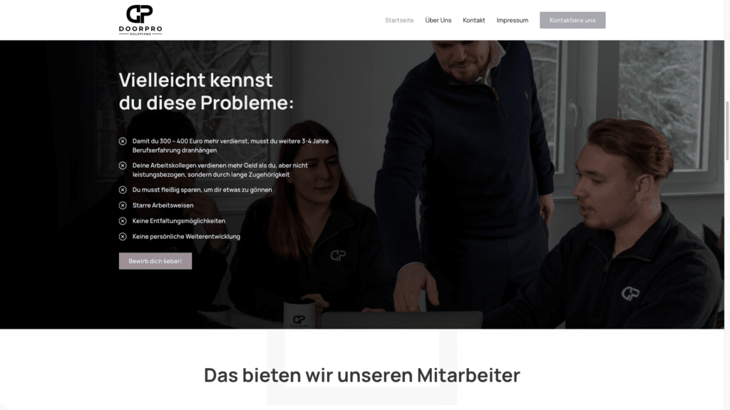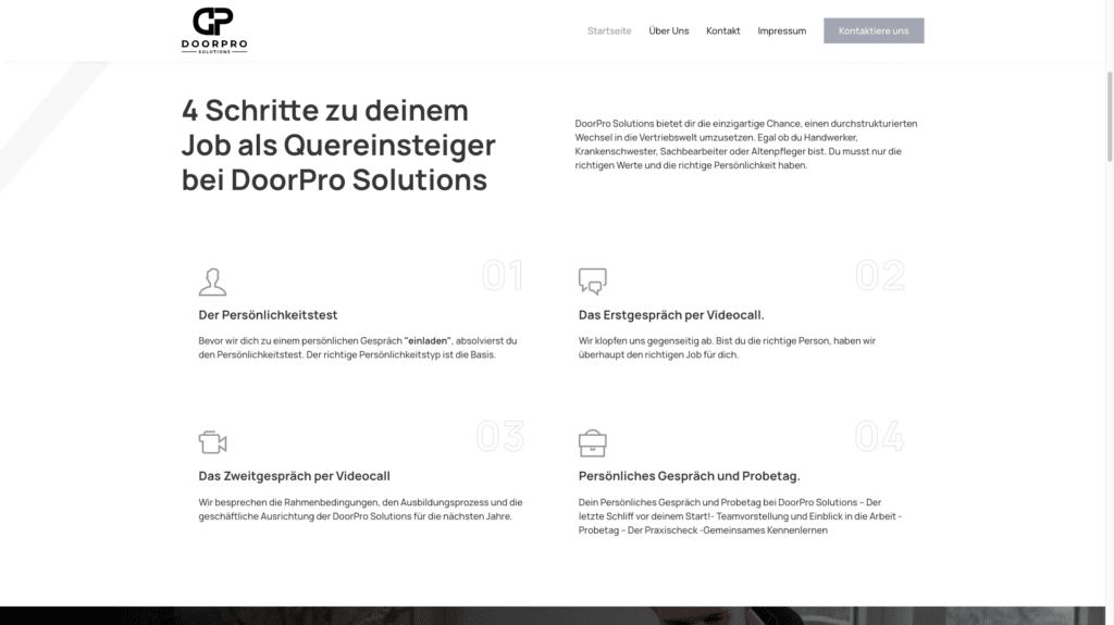 Durch die Neugestaltung der Webseite von DoorPro Solutions konnte das Unternehmen seine Online-Sichtbarkeit und die Qualität der eingehenden Bewerbungen erheblich verbessern. Die hochwertige und professionelle Gestaltung der Webseite trägt maßgeblich dazu bei, die Unternehmenswerte zu vermitteln und potenzielle Mitarbeiter zu überzeugen.